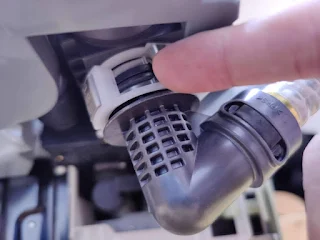 ホースのもう片方、角度がついてる側は、機能部に差し込みます。上と同様に、しっかりとロックされていることを確認します。(無理な体勢で撮影したので、画像が横になってしまってます)